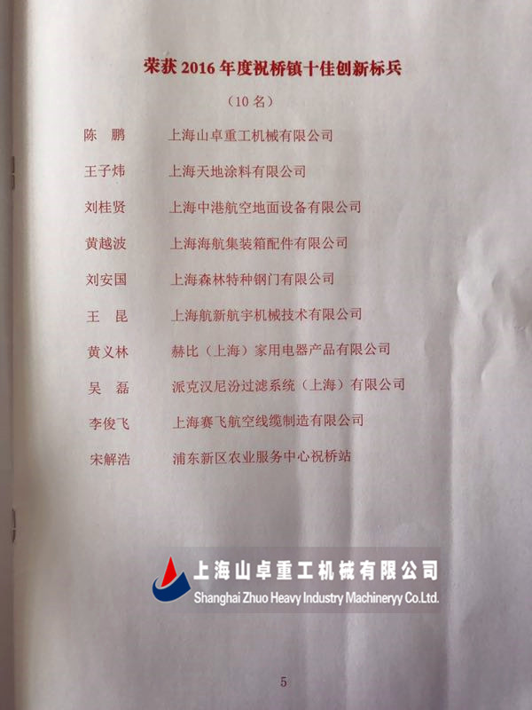 熱烈祝賀上海山卓重工陳鵬獲得2016年度浦東新區(qū)祝橋鎮(zhèn)“十佳創(chuàng)新標(biāo)兵”